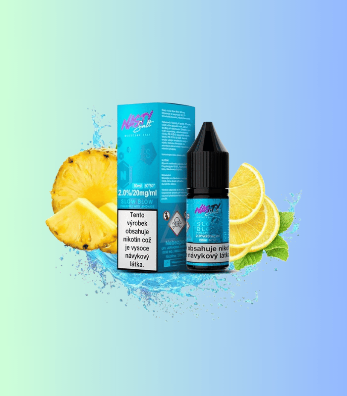Nasty Salt Slow Blow přináší harmonii tropického ananasu, limetky a jemného mentolu. Díky 20 mg nikotinové soli a poměru 50VG/50PG zajišťuje hladký potah a svěží chuťový zážitek. Skvělá volba pro MTL vapování s tropicko-citrusovým twistem.